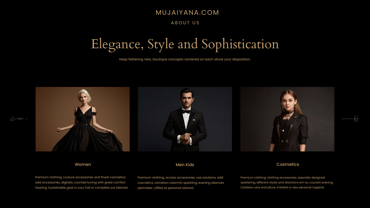 Mujaiyana.com is a premier fashion destination dedicated to bringing elegance, style, and sophistication to women, men, and kids. Our mission is to offer curated collections that blend contemporary trends with timeless fashion, ensuring every individual can express their personality through clothing and accessories. From luxurious dresses and tailored suits to stylish casual wear and vibrant kids’ outfits, every piece is crafted with quality, comfort, and attention to detail.